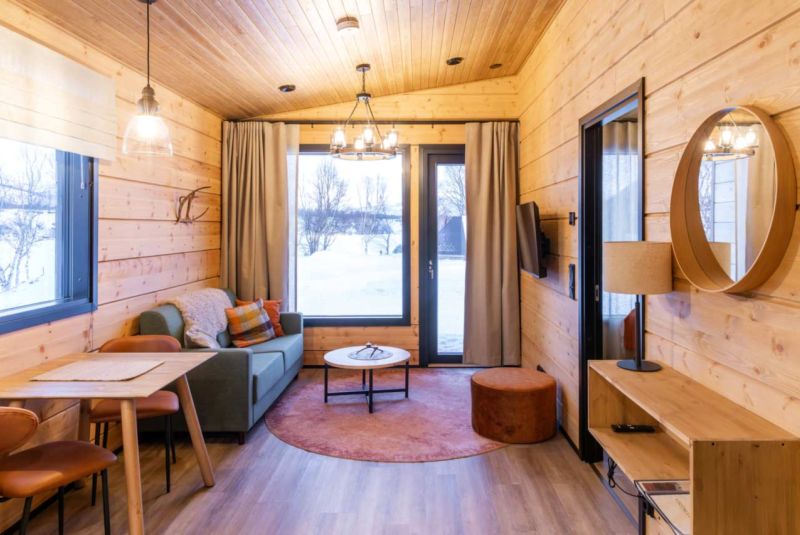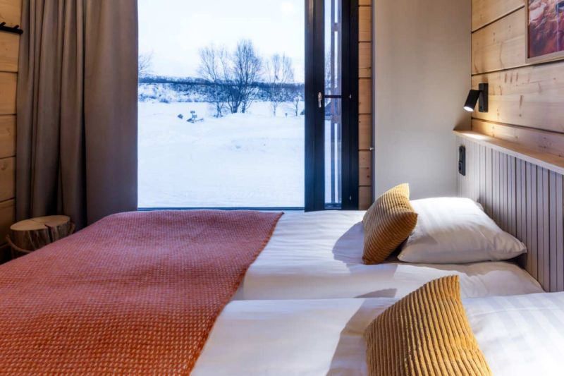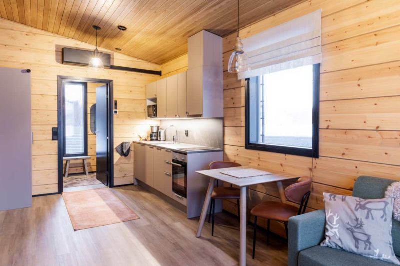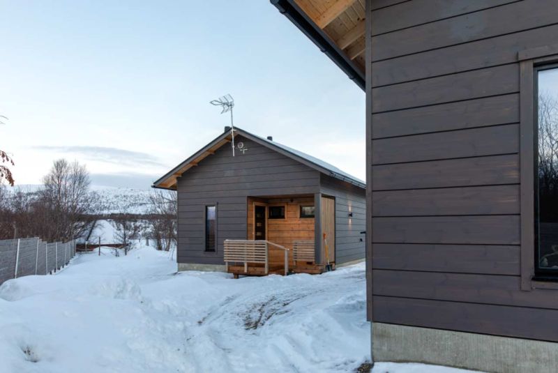 Olohuoneessa on isot ikkunat, joista on näkymä viistottain Tenojoelle ja Norjan tuntureille sekä pohjoisen taivaalle. Terasseilla voit ihastella kesällä keskiyön aurinkoa sekä syksyllä ja talvella revontulia. Vuoden ympäri voit vain nauttia mahtavista maisemista ja hiljaisuudesta.